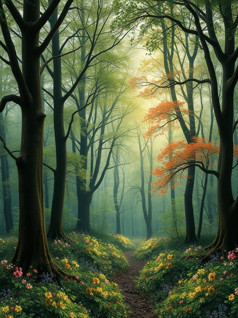 A vibrant image of a lush forest scene with ancient oak trees, ivy, and colorful flowers. The artwork evokes the opulence of spring in an Art Nouveau style, with emerald, sapphire, and amethyst hues.