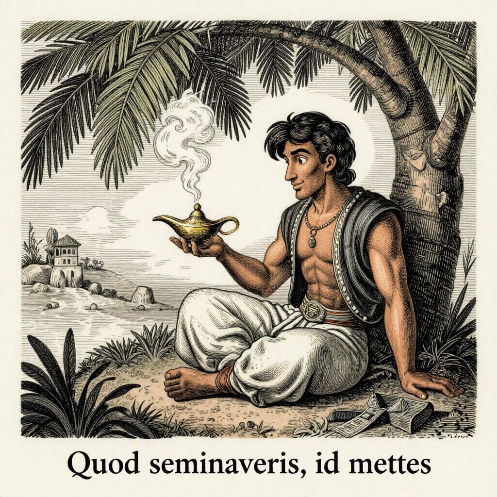 This image depicts Aladdin with a genie appearing from a magic lamp under a palm tree, rendered in a detailed vintage ex-libris style with aged colors, evoking adventure.