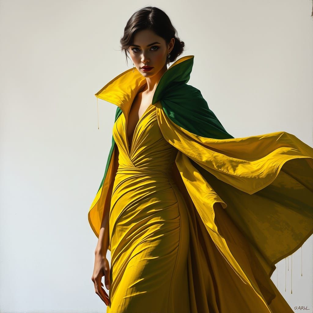 A painting on gesso board depicting a striking high fashion editorial featuring a woman adorned in a vibrant yellow Elie Saab gown complemented by a flowing green and yellow cape. The woman stands confidently against a stark white backdrop, her face partially obscured by dramatic shadows, her expression ...