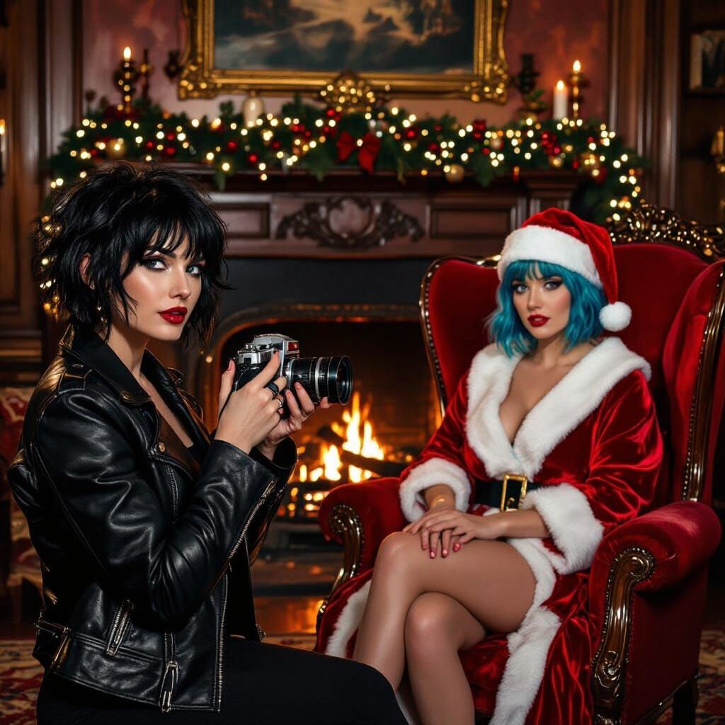 This image shows a French woman with a leather jacket taking photos in a dark Victorian mansion. Nearby, a woman in a Santa hat poses by a fireplace.