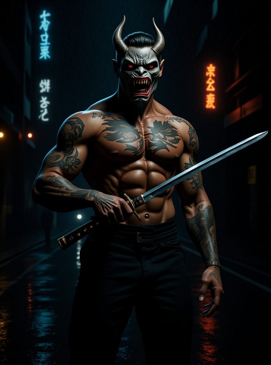 A muscular Japanese yakuza enforcer, covered in irezumi tattoos, wearing an oni mask and holding a katana on wet Shinjuku streets at night. Photorealistic style.