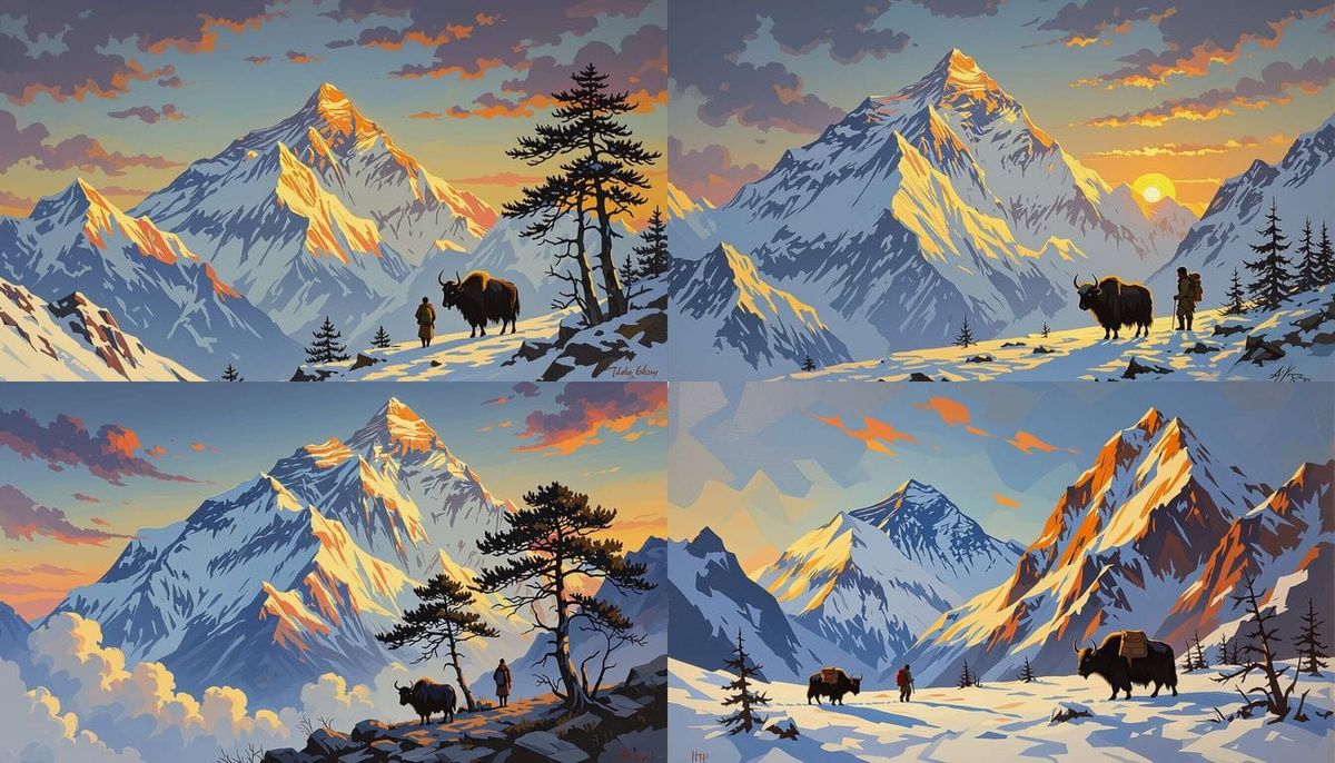 This image is an oil painting created with knife strokes, depicting Mount Everest at sunrise with a yak and a porter. It evokes a sense of adventure and natural beauty.