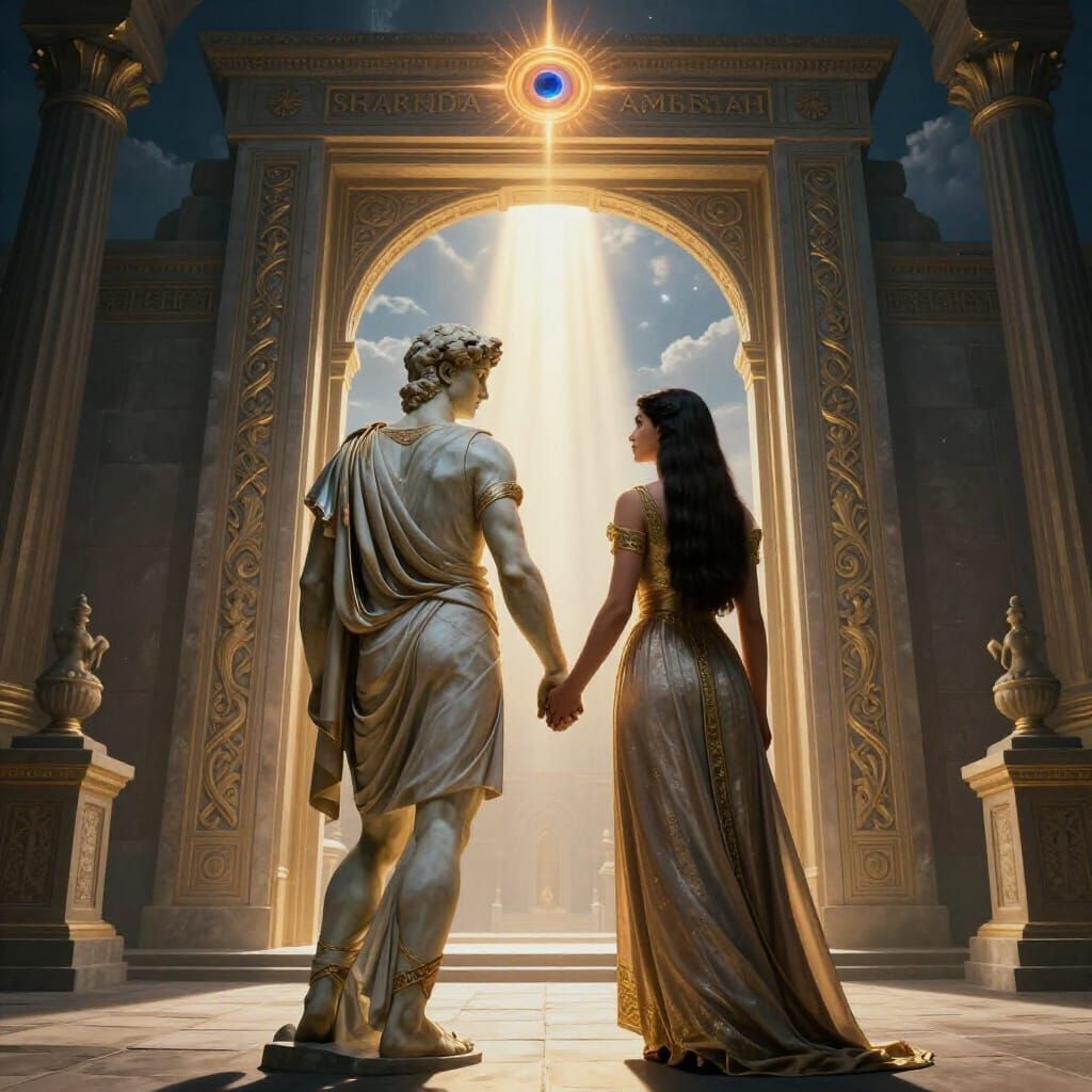 michelangelo statue guy dressed walks with beautiful armenian woman with ultra straight hair, They hold hands, , in front of the entry door ofcity of shamballah. , very connected spiritual, third eye chakra, hidden in the sky; ray of lights between characters, ultra deep contrast, large scene composition, ...