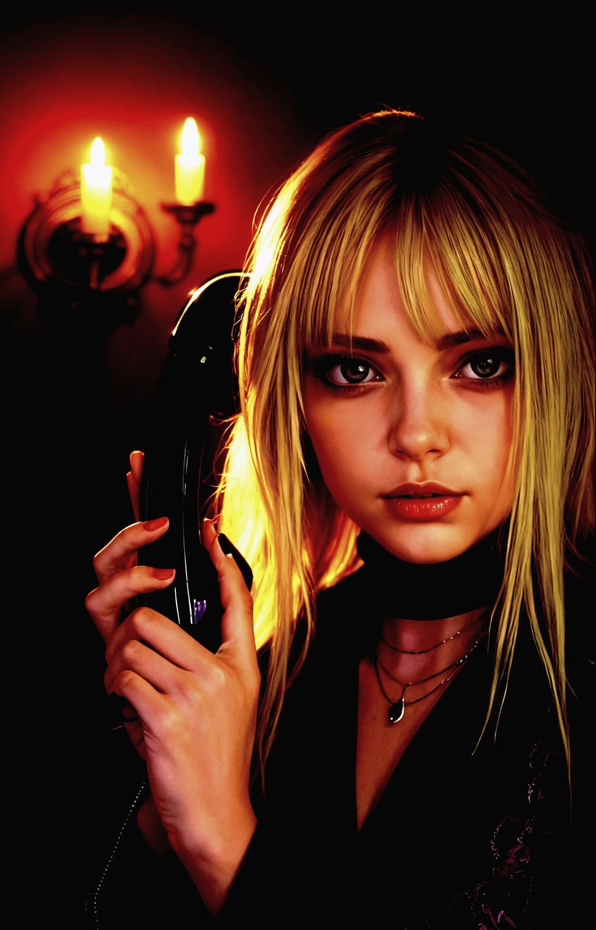 This image shows a gothic sorceress concentrating as she uses a rotary phone to comb her long white hair. The art style is dark fantasy with an eerie atmosphere.