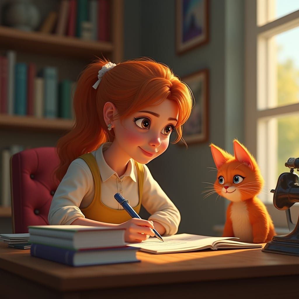 This image shows a focused woman writing at a vintage typewriter in a cozy studio filled with books, a cup of coffee, and a curious red cat. The scene is rendered in 3D digital art with a Pixar and Disney-inspired style, evoking a cinematic atmosphere.