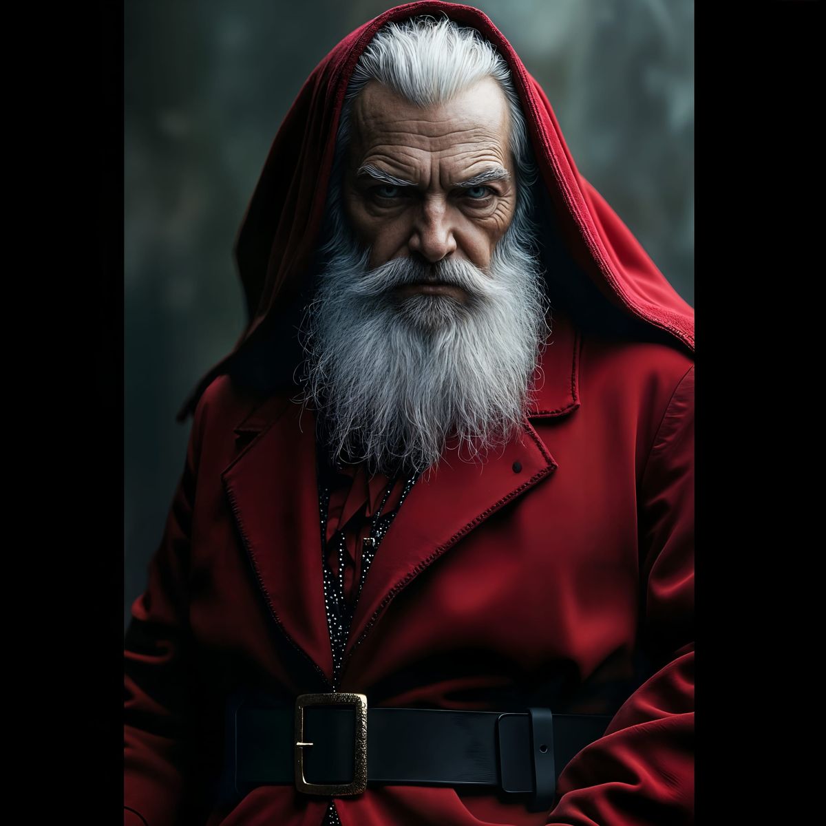 This image features a classic Santa Claus rendered in a dark, dramatic style. The portrait emphasizes a moody, intense atmosphere.