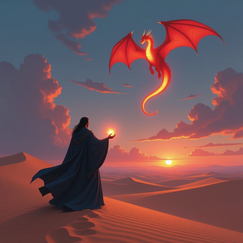 This image shows a wizard in flowing robes on sand dunes, summoning a red dragon. The scene evokes dreamlike landscapes with vibrant colors and intricate textures, reminiscent of digital artwork.