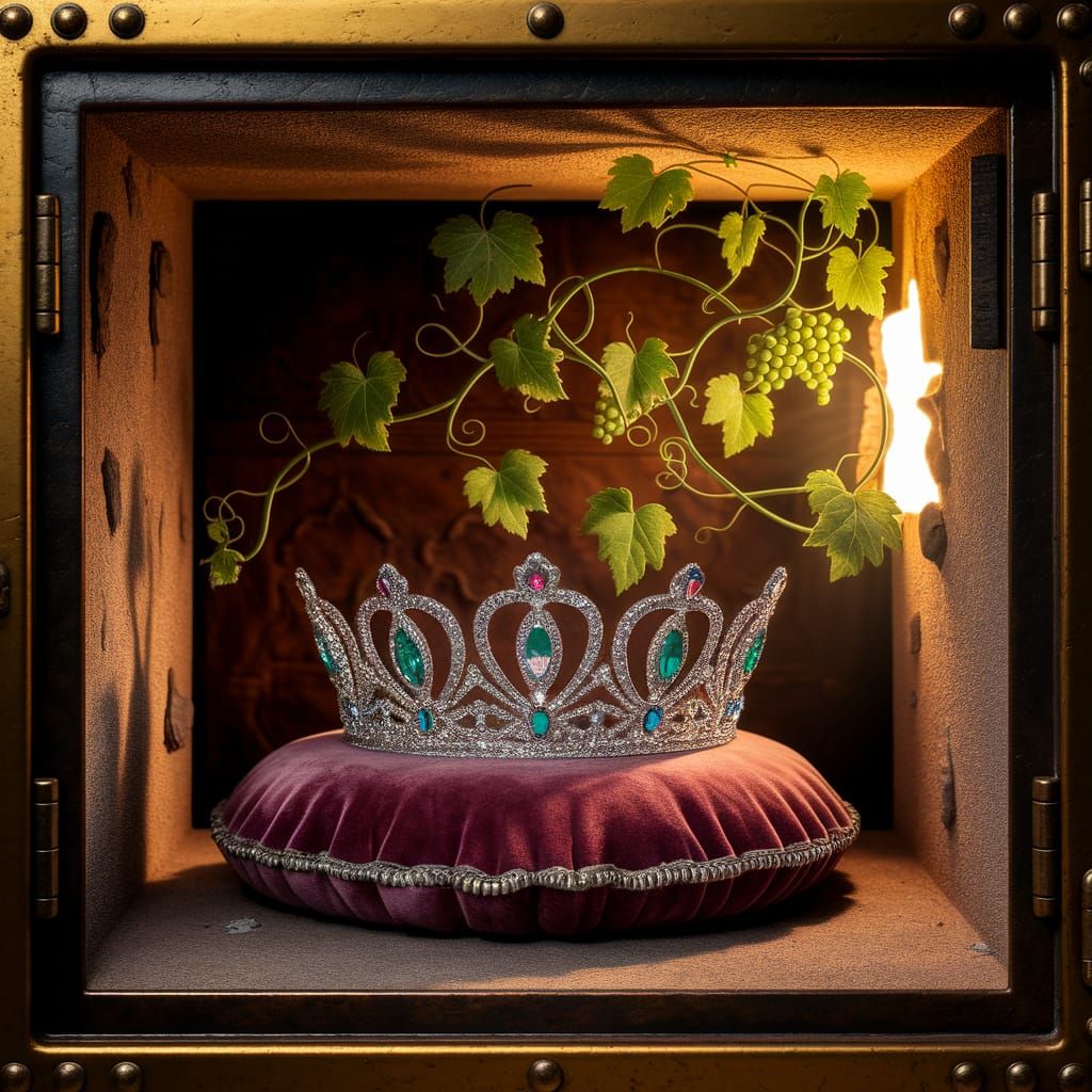 ... guess what we found! The safe was discovered long after she passed away, hidden behind a mirror ... The stories her tiara could tell ... And how could a grapevine flourish in such surroundings? We shall never know ... (for daily challenge #1034)