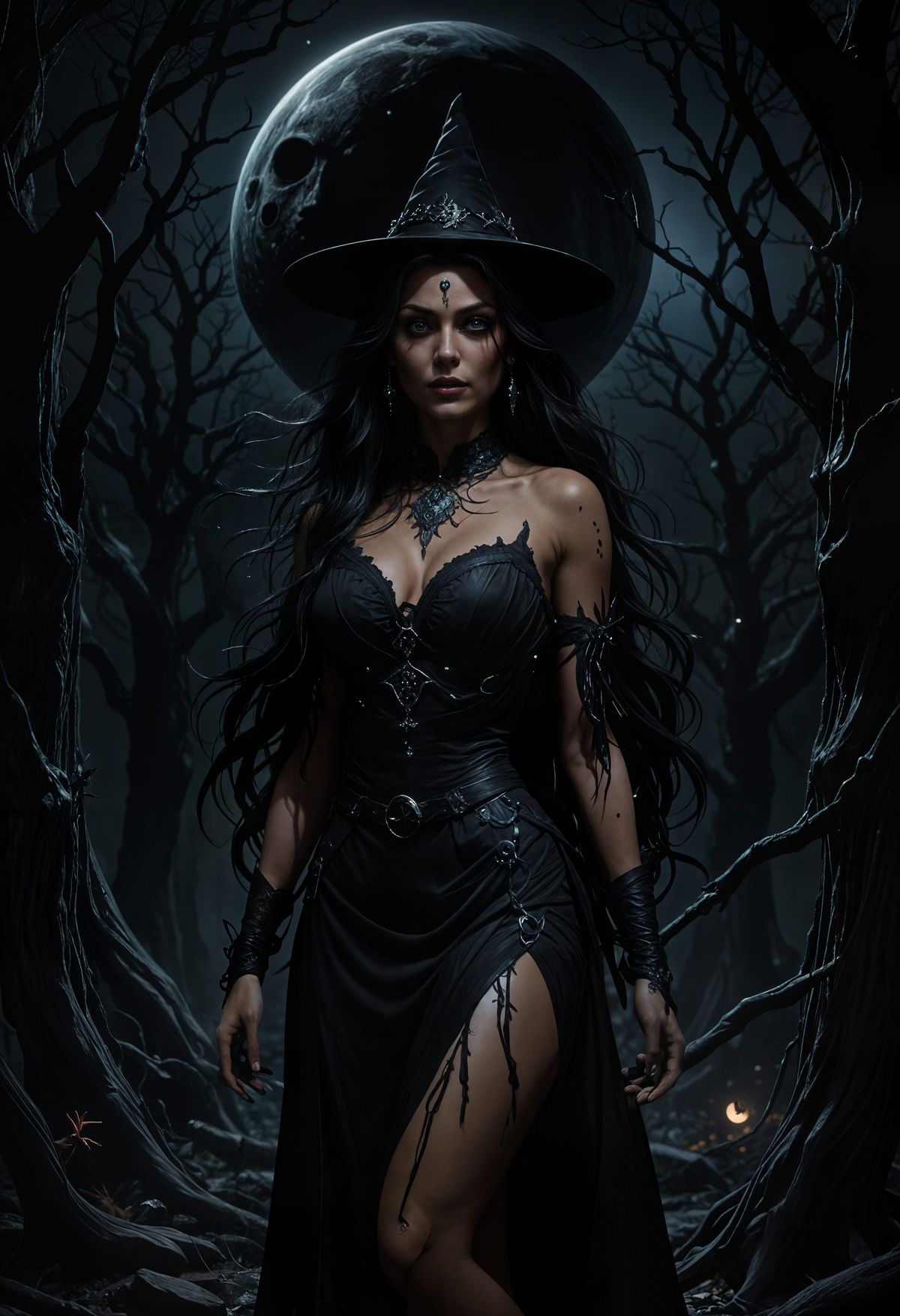 This image shows a witch beneath a dark moon, surrounded by glowing runes and dancing shadows. The artwork is a hyper-realistic digital painting with gothic and mystical elements in jewel tones.