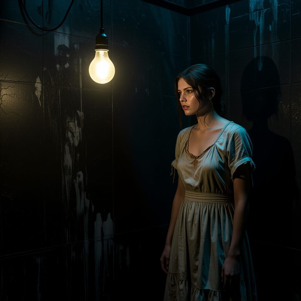 This image shows a woman in a tattered dress staring at a flickering lightbulb in a dark room. The image is reminiscent of dystopian digital matte paintings.