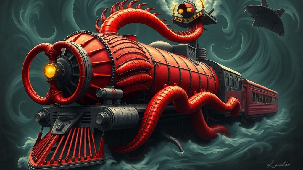 This image shows a nightmarish fusion of a steam train and submarine, crafted from the twisted, crimson flesh of a giant Killer Queen, with glowing eyes and a swirling, bioluminescent aura, reminiscent of H.R. Giger's biomechanical art and Zdzisław Beksiński's surrealism.