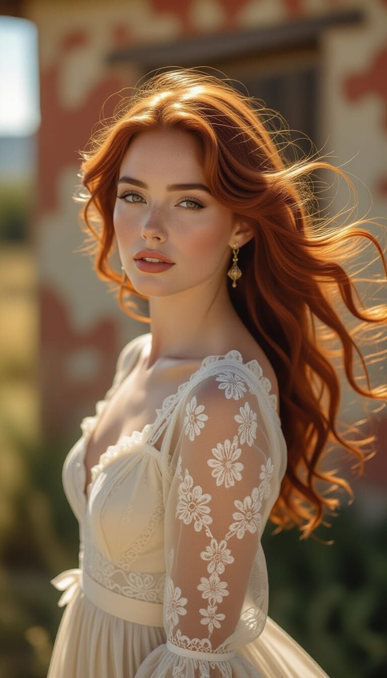 This image shows a beautiful auburn-haired woman with flowing hair, against a rustic background. The artwork blends Chicano art with elements of Romanticism and feminist themes, reminiscent of vintage film with warm lighting.
