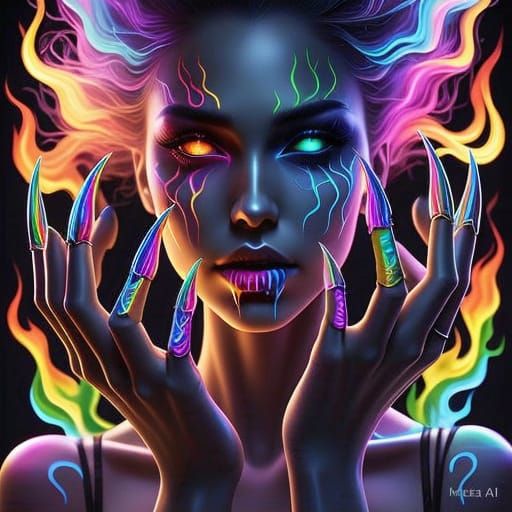 A mysterious figure with glowing rainbow eyes and vibrant flame hair, surrounded by electric neon colors and trails of flames, exudes dark beauty and gothic allure.