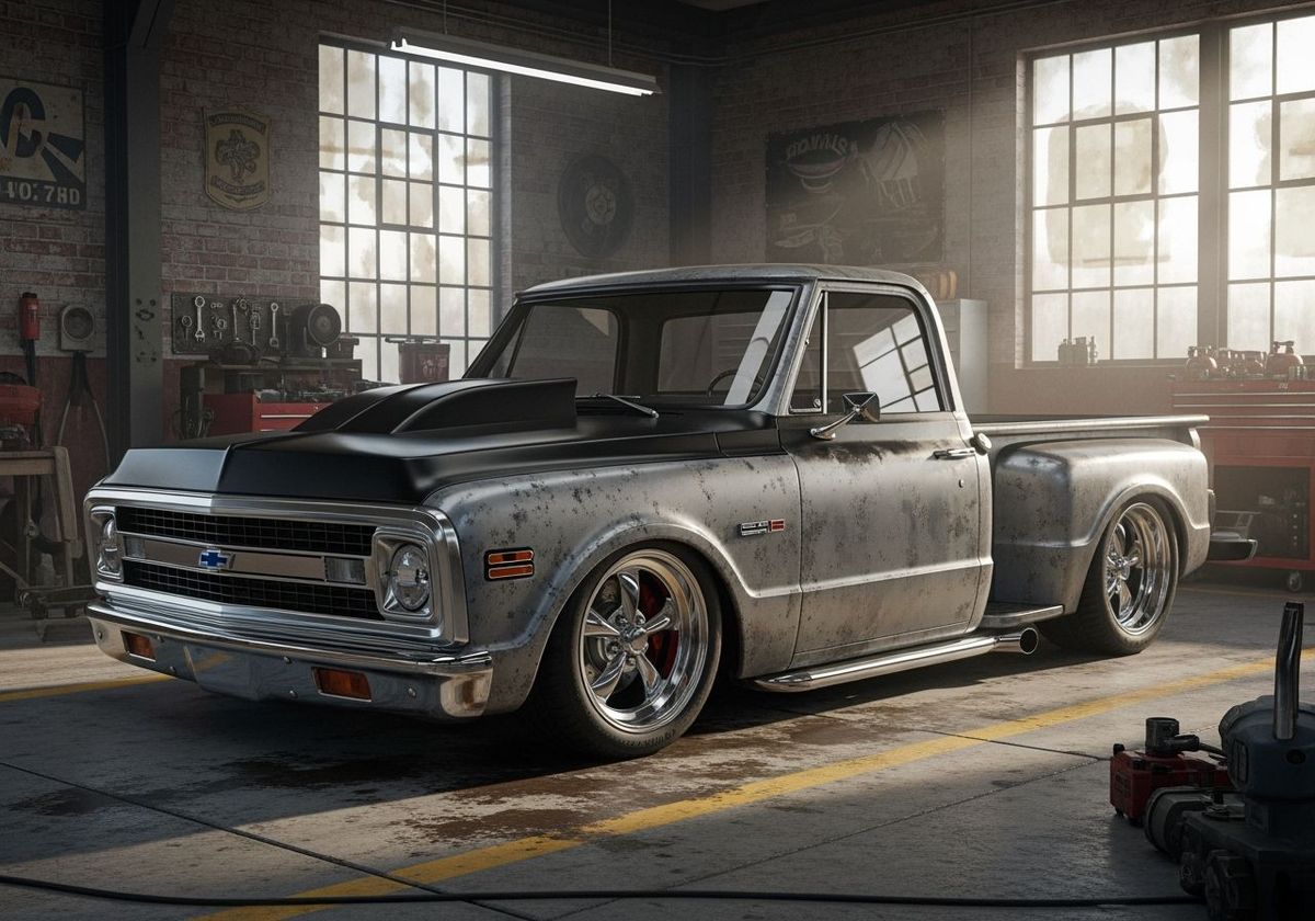 This image shows a classic 1970 Chevrolet C10 Stepside pickup truck inside an old garage. The truck's design blends aged Americana with futuristic industrial elements, rendered with high detail in a sleek, photorealistic style.