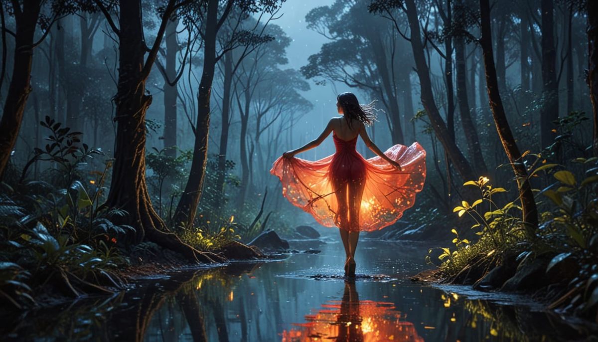 This image depicts a beautiful woman holding an open rose at night, with shimmering details and watercolor edges. It features a silhouetted figure with a triple exposure effect in a magical forest.
