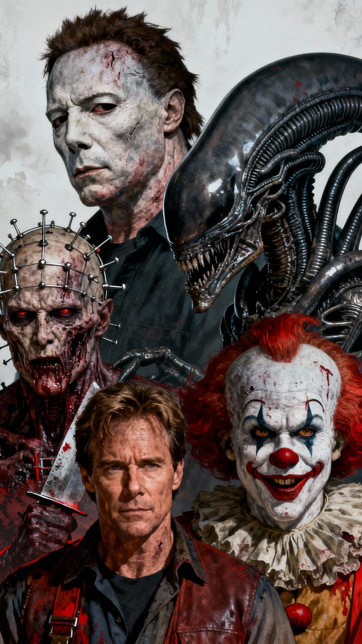 This hyper-realistic image features a triple exposure of famous horror movie characters, created with intricate detail and a dark, gothic aesthetic.