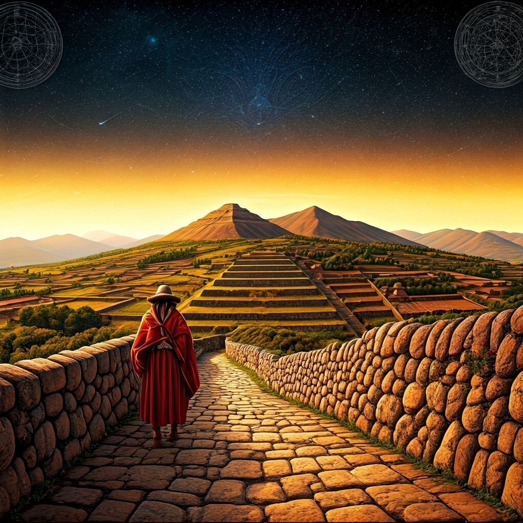 A vibrant image of an Andean landscape with Inca roads and ancient markets. Pyramids rise toward the sky with surreal and romantic qualities, botanical details, and geometric patterns.