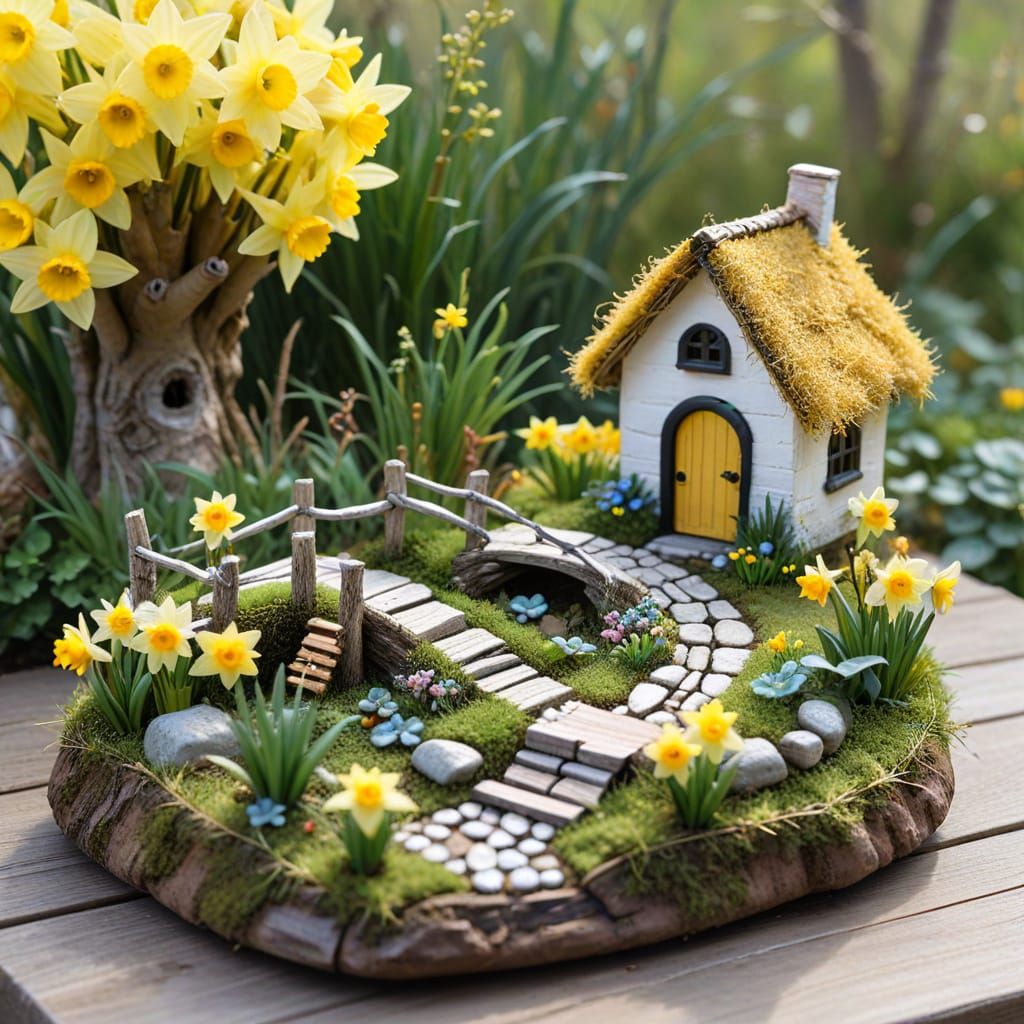 This charming image shows a whimsical miniature landscape featuring a tiny cottage with a bright yellow hay roof, surrounded by tall yellow daffodils and a delicate birch bridge, all set amidst a serene and idyllic scene.