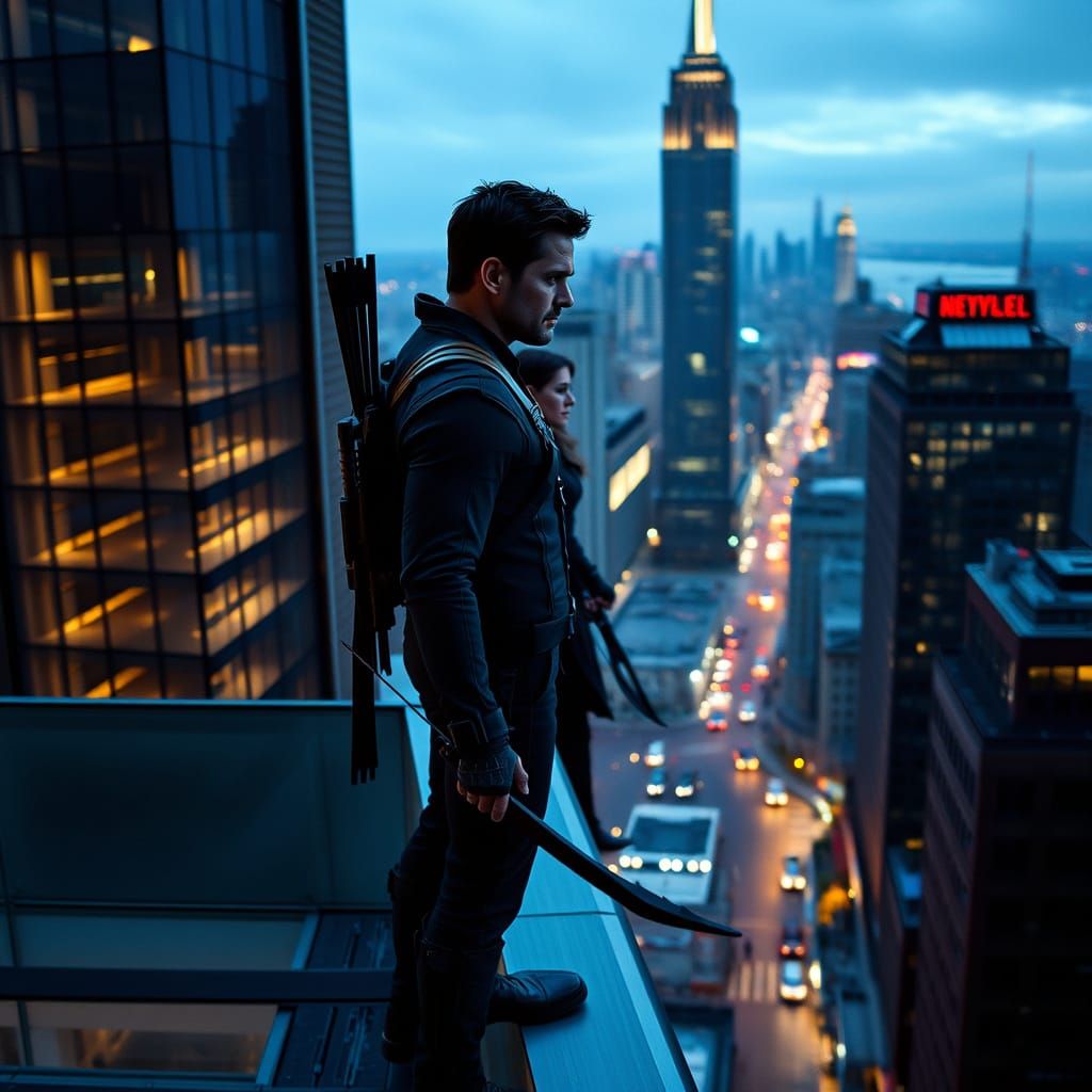 A dramatic image of Marvel's Hawkeye and Zatanna standing on a New York City rooftop, scanning the city below with intense focus, amidst a moody, atmospheric backdrop of dark tones and neon lights, evoking a sense of cinematic heroism