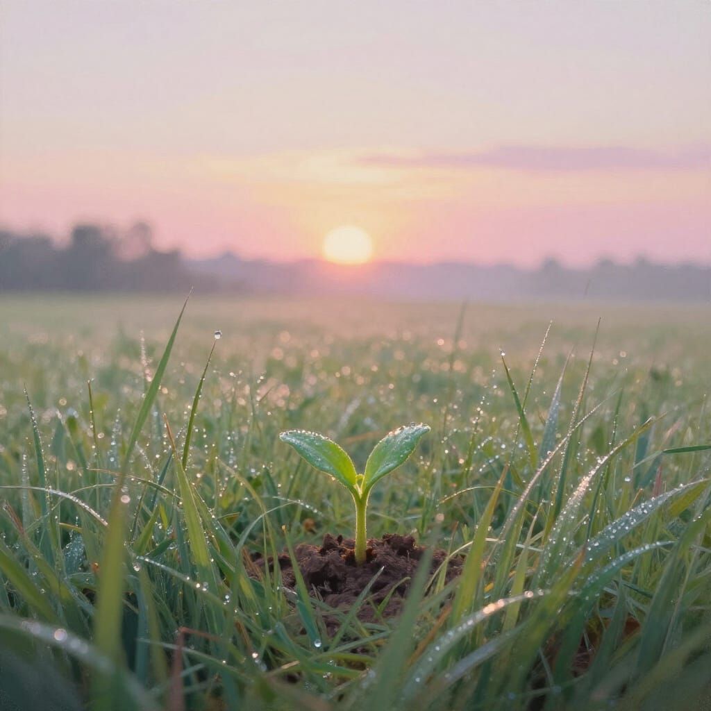 This image shows a tranquil meadow at sunrise with glistening dew and a vibrant green sprout symbolizing new beginnings, painted in a gentle impressionistic style with soft pastels.