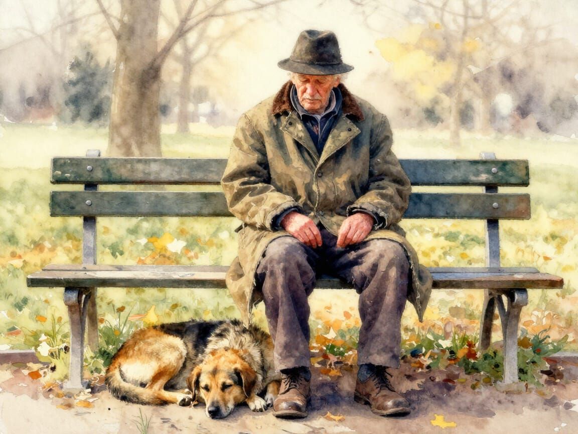 This image depicts an elderly man in a peacoat and cap with his dog on a park bench during golden hour. Rendered as a loose watercolor wash with bleeding colors and soft light.