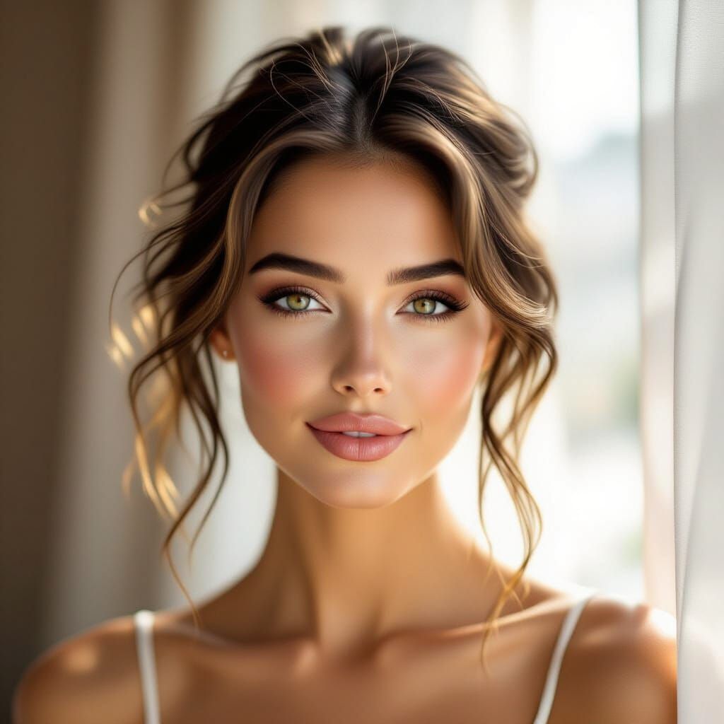 A captivating portrait of a woman with radiant skin and hazel eyes, smiling softly. The image is bathed in golden light with a blurred apartment backdrop, rendered with vibrant colors and atmospheric lighting.