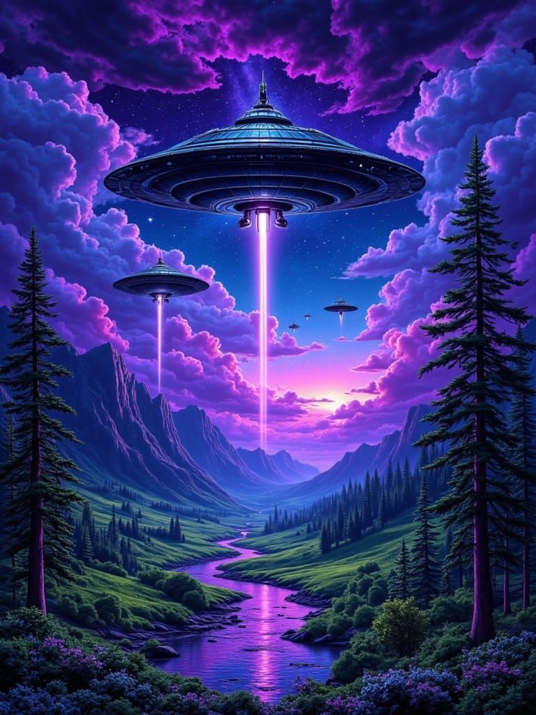 This image shows a vibrant, surreal night landscape with two glowing triangular UFOs emerging from purple storm clouds. A winding river reflects neon lights, set against lush greenery and mountains in a psychedelic vaporwave style.