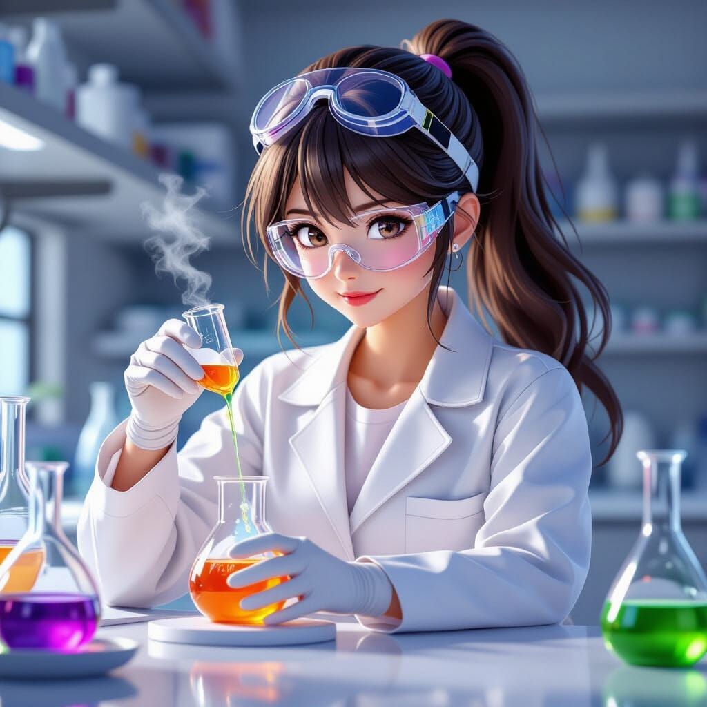 A captivating image of a strong and attractive female chemist in her lab. She's mixing vibrant chemicals, rendered with ultrafine details and textures in a 3D anime style.