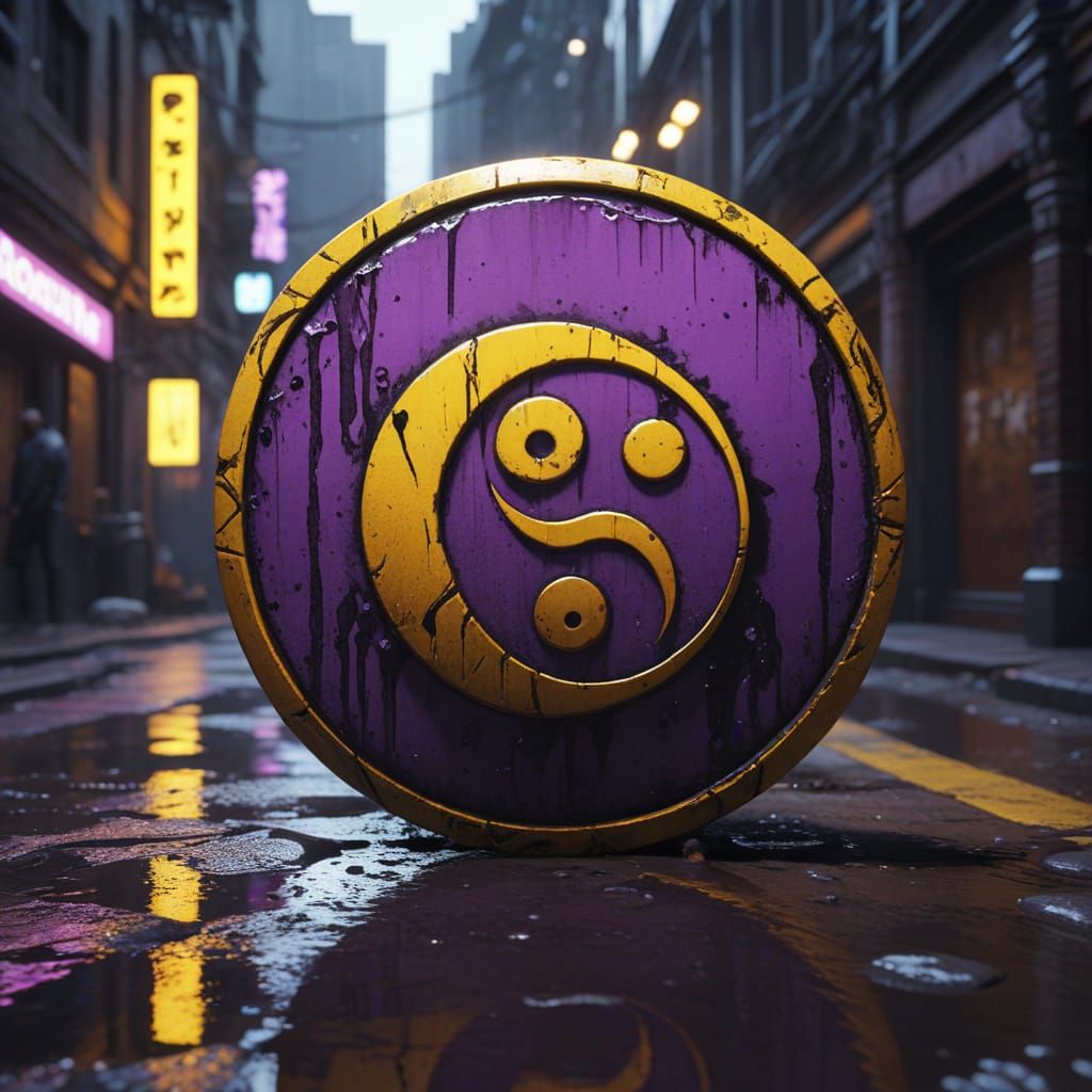 This image shows a yin and yang symbol in a dark alley, depicted in a digital painting style. Neon lights reflect off wet pavement with purple and yellow hues in a cyberpunk aesthetic.