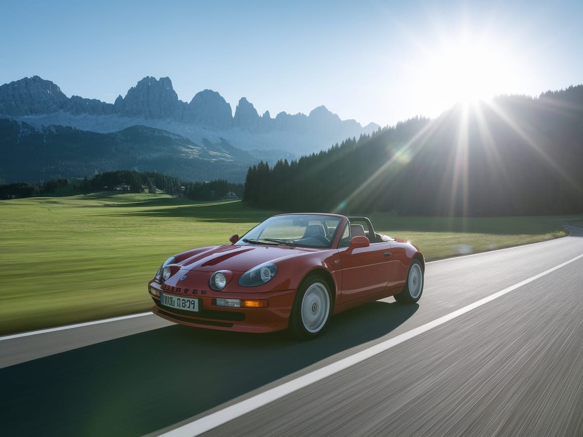 This image depicts a red 1995 Alpine A610 roadster driving through a sunny Tyrol landscape. The vehicle features a steampunk-inspired engine.