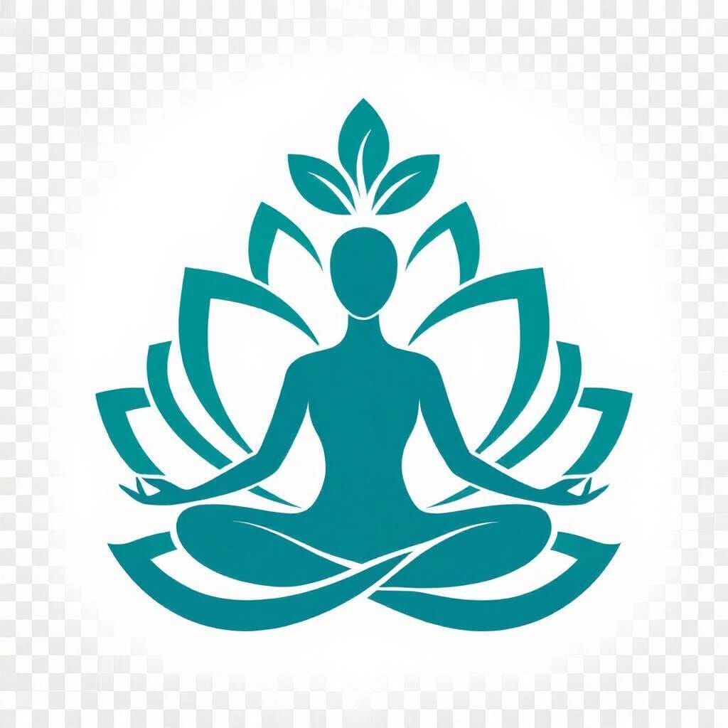 A fluid and harmonious vector logo depicting a stylized human figure in a meditative pose with arms raised and leaves above the head. Modern, zen, and elegant art style.