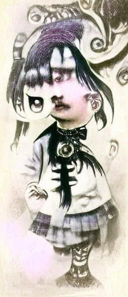 This image depicts a chibi-style figure in a Victorian Goth aesthetic. The artwork evokes Kandinsky's abstract style.