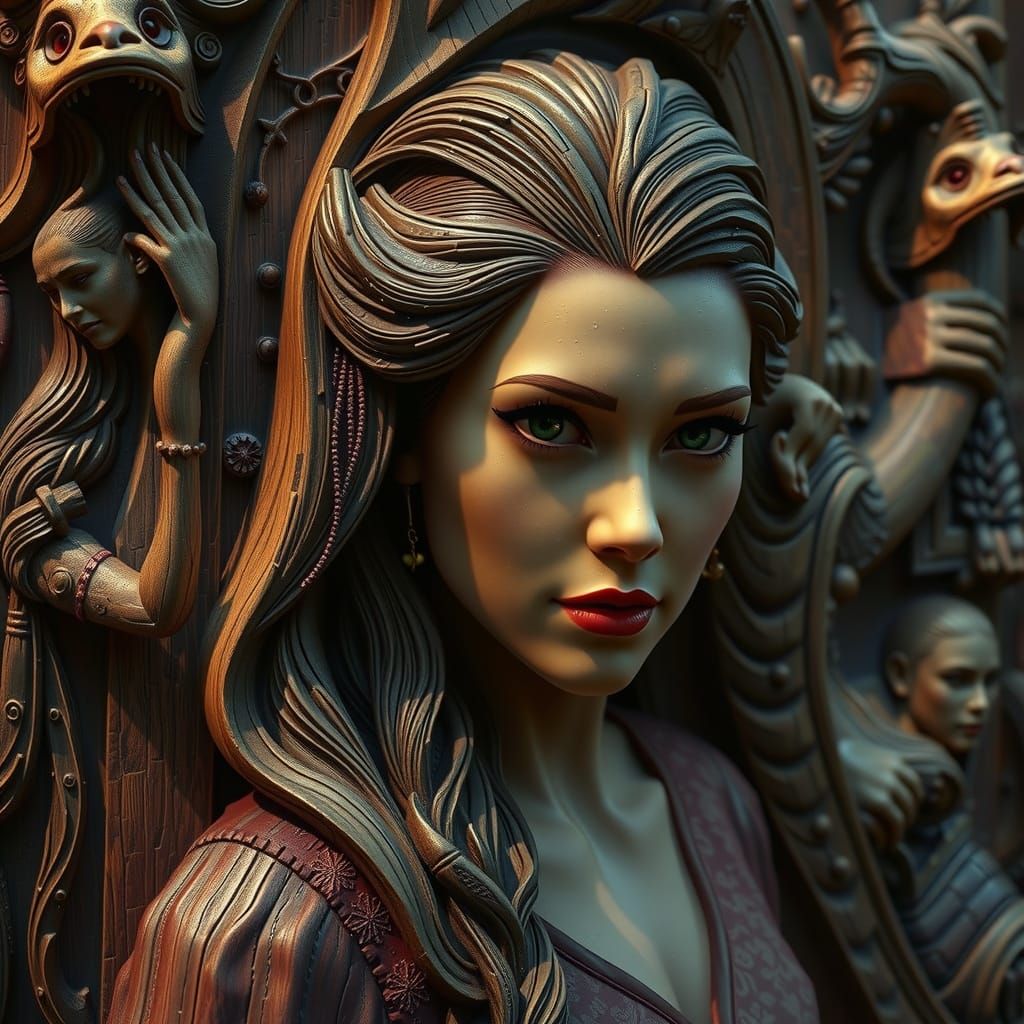 This image shows a detailed wood carving of Anna Kendrick with deep colors and intricate details. The artwork is reminiscent of fantasy concept art in 8k resolution.