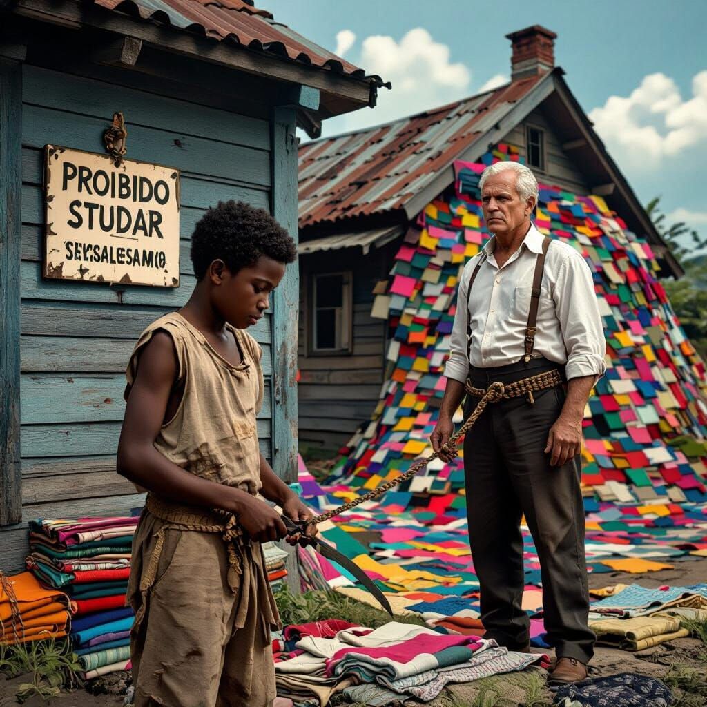 A striking picture of a Black boy cutting fabric with a machete next to a wooden house. Rendered as detailed matte painting with fantasy elements and vibrant complementary colors. Resembles digital artwork trending on ArtStation.