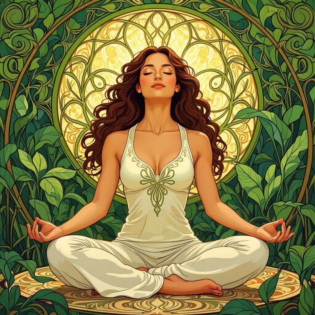 This image shows a vibrant woman practicing yoga amidst lush greenery. The artwork features intricate organic patterns and warm golden light, reminiscent of flowing art nouveau illustrations.