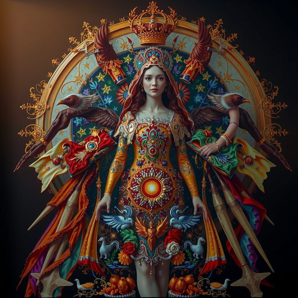 This intricate painting showcases a central figure representing truth, bathed in soft light, surrounded by symbolic elements in a harmonious composition. Rendered with masterful technique.