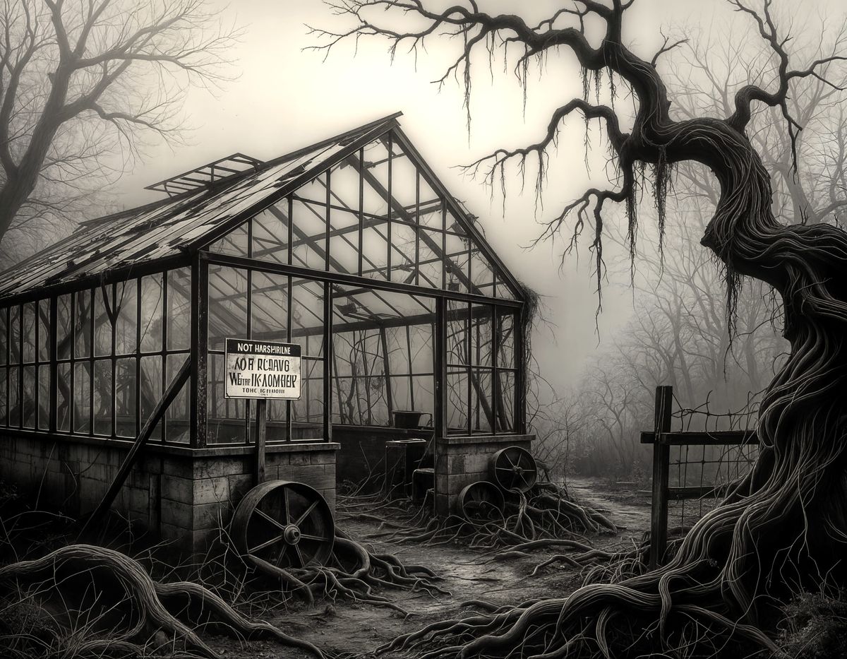 A black and white image of an abandoned greenhouse overtaken by nature. Weeds, vines, and small trees fill the space, with mist illuminated by eerie light in a romantic charcoal drawing style.