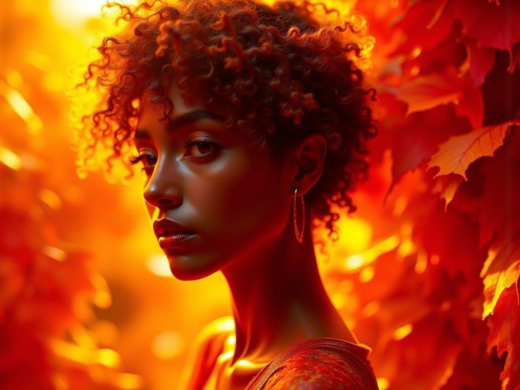 This image features Dichen Lachman portraying Jhene Aiko with a striking, high-definition appearance. Deep contrast and glowing amber, yellow, and red tones create a dramatic effect in an art nouveau style.