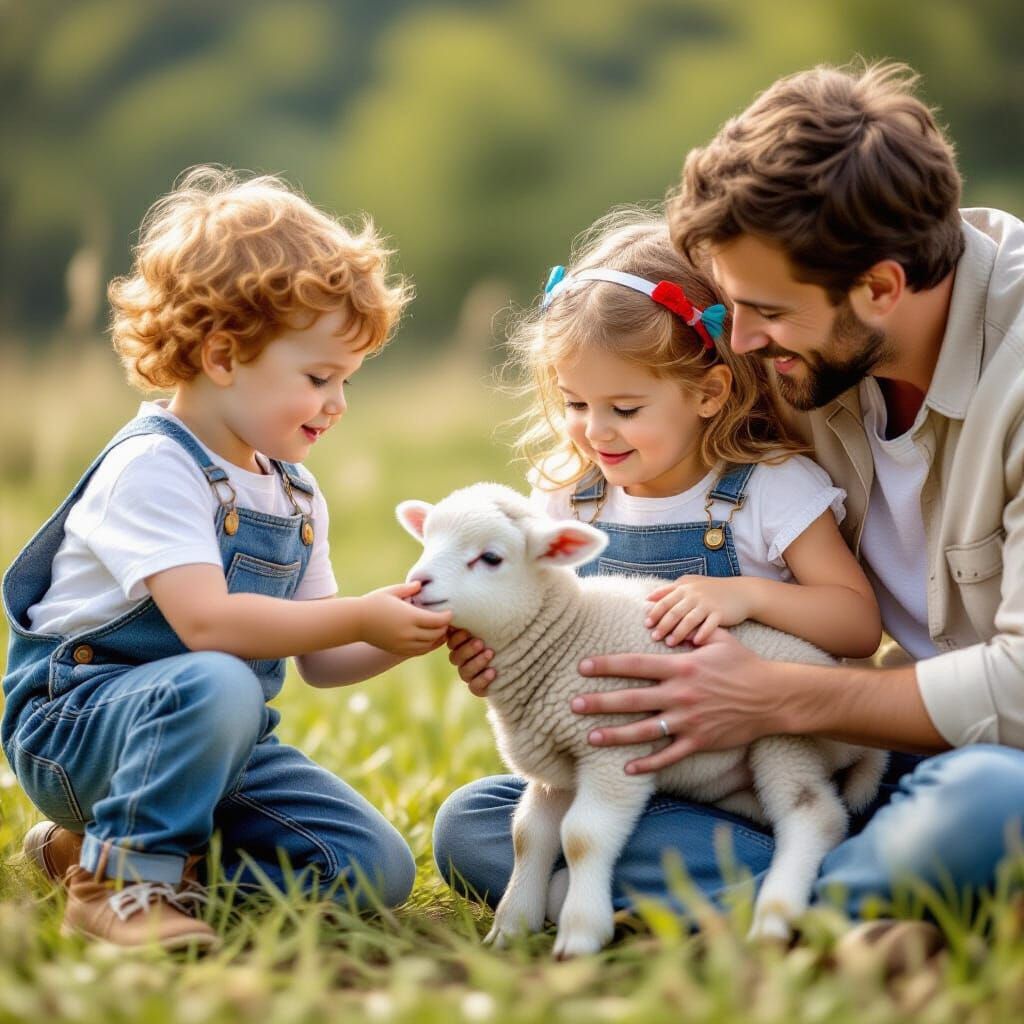 This image shows a heartwarming scene of young freckled twins feeding a lamb alongside their parents in an outdoor natural setting.