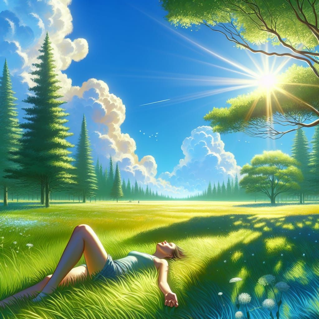 This idyllic scene captures the essence of bliss, with a sunlit meadow stretching to the horizon, surrounded by swaying trees and fluffy white clouds. A peaceful woman lies on the lush grass, basking in the warmth, exuding tranquility.