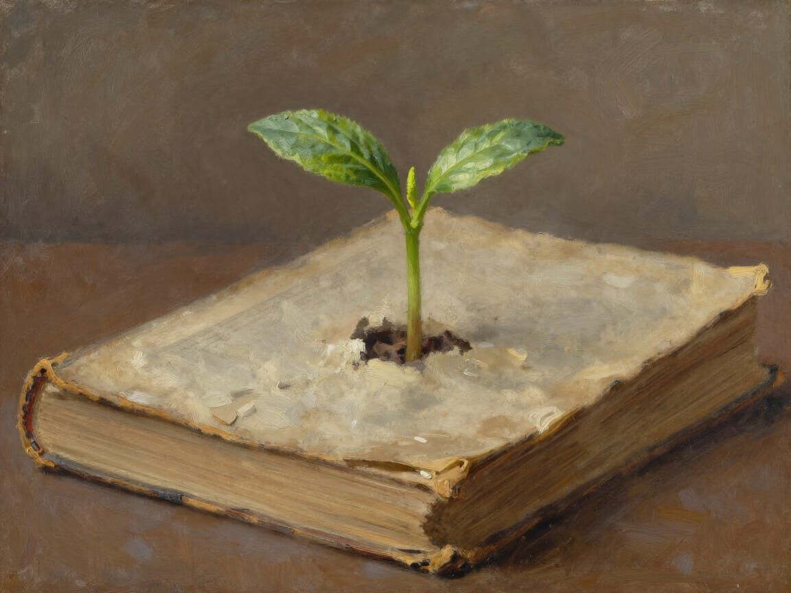 This image shows a lone green sprout emerging from the pages of an old book, rendered with expressive brushstrokes and a warm, muted color palette. It highlights resilience and new life against decay.