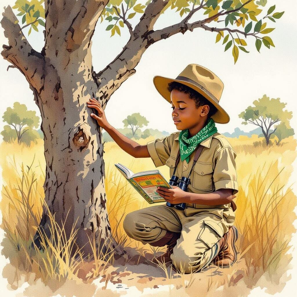 This image shows a young African boy explorer named Knowledge kneeling by a tree. He's wearing a safari uniform and examining the bark in a warm watercolor style.
