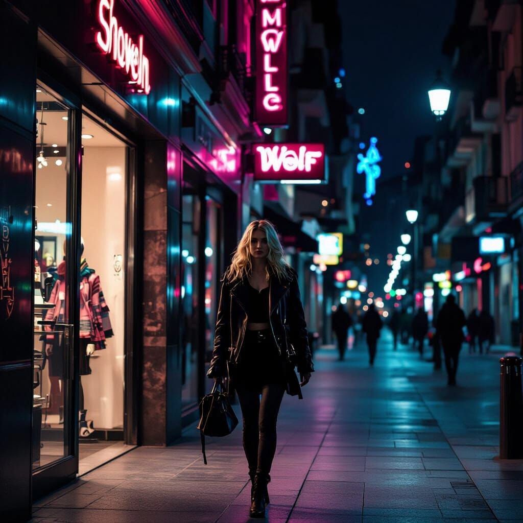 This image shows a blonde woman leaving a mall at night in Barcelona. The scene is illuminated by street lights, creating a moody, cinematic atmosphere with a blend of Gothic and Cyberpunk styles.