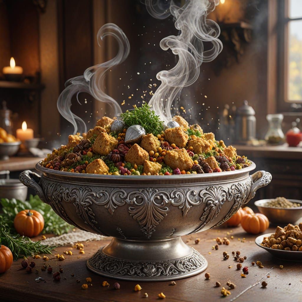 This concept art showcases an ornate silver bowl overflowing with golden stuffing, surrounded by herbs and spices. The image features warm, inviting lighting and intricate detail, presented in a fantasy style.