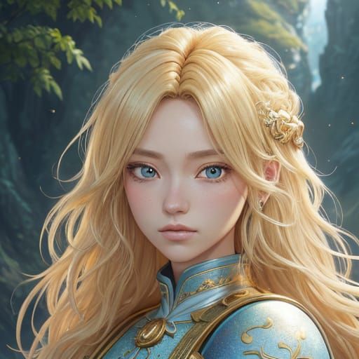 This image shows a close-up of a blonde-haired girl in a chibi style. The vibrant digital art features sparkling eyes, fluffy hair, and soft golden lighting against a dreamy fantasy backdrop.