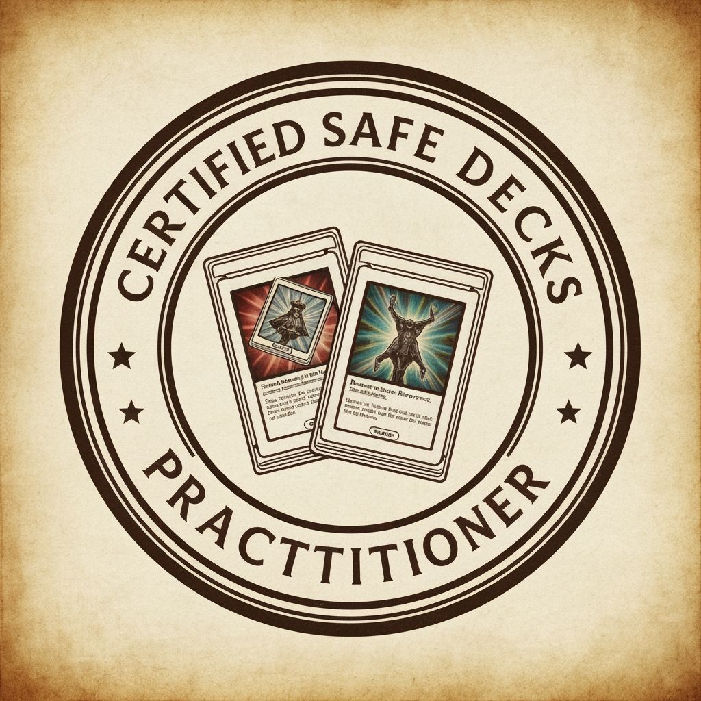 This image showcases a vintage circular seal declaring 'Certified Safe Decks Practitioner'. It features protective-sleeved trading cards at its center, rendered with an aged paper texture and embossed effect for an official look.