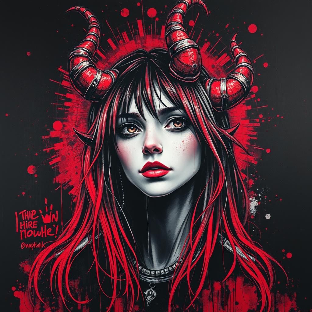 A striking airbrush painting depicts a horned female figure with messy black and red tones, evoking a heavy metal album cover aesthetic with intricate background doodles.