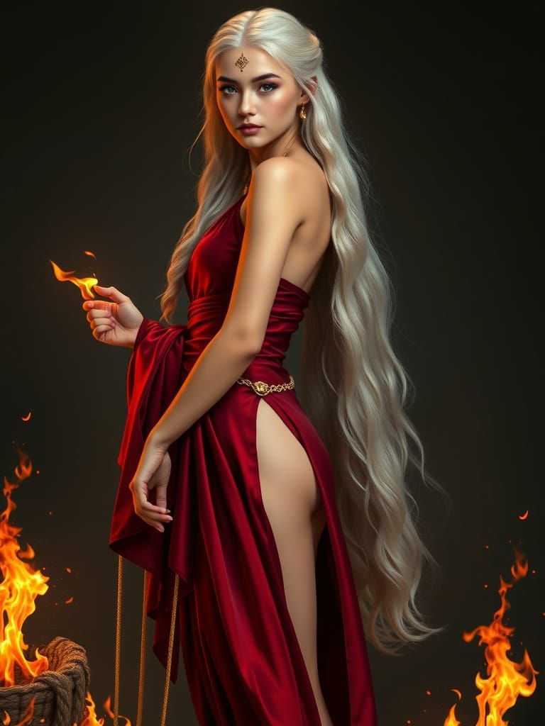 A majestic portrait of a princess in deep crimson silk, exuding quiet strength and divine fire, with porcelain skin, silver hair, and piercing violet eyes, set against a backdrop of flame and shadow, in a style reminiscent of Caravaggio and Gustav Klimt