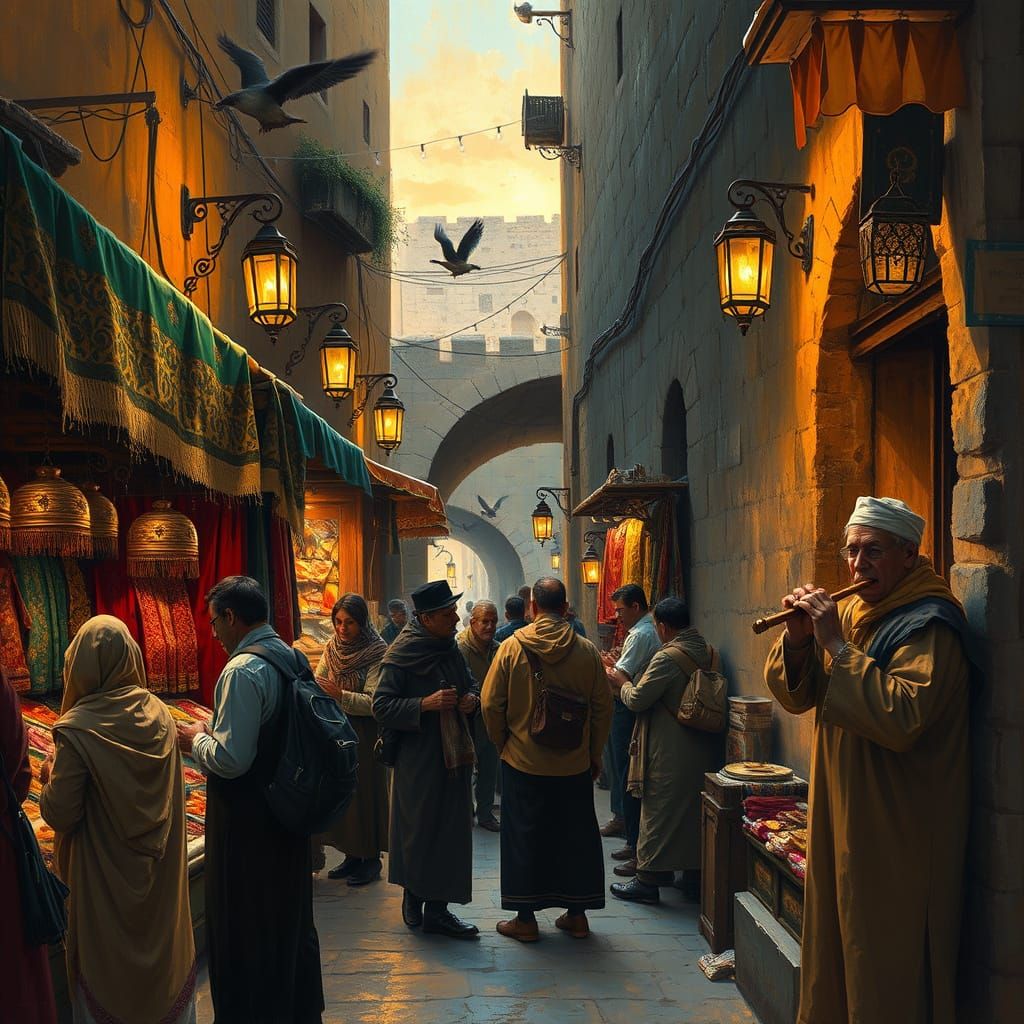 This image captures the magic of a bustling market at dusk, with vendors closing up shop and customers negotiating final purchases. A lone musician adds to the atmosphere with a haunting melody, as warm light spills from lanterns and across the ancient stone alleyway.