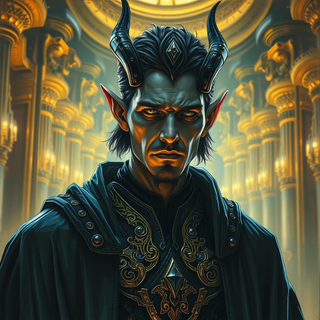This image depicts a close-up of a handsome dark elf warlock wearing intricate futuristic robes in a neo-classical cyberpunk palace. The scene is set inside a brutalist mega-structure, blending elements of cyberpunk and fantasy.